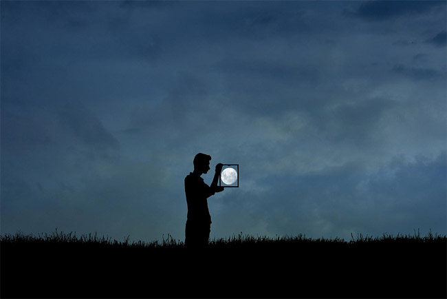 不需要太多的器材與布景設置,單靠他的藝術天分就創造出這般超乎一般人想像的畫面與場景。有倚在月亮上的模樣,也有將月亮當作籃球的畫面等,以剪影的方式呈現,黑黑的人影跳脫了現實世界的準則,彷彿是影子與月亮在玩遊戲!