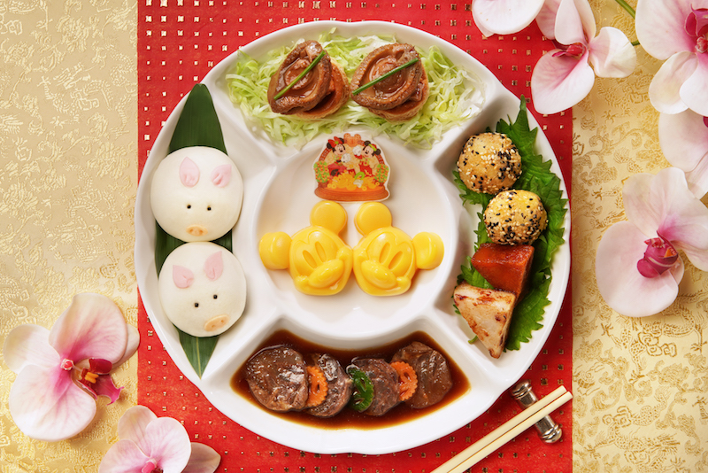 美食方面,香港迪士尼在樂園及酒店會推出共60款賀歲佳餚,像是在巿集餅店可享用「金元寳」造型美點,「元寶布甸杯」、「年年有餘」和「吉星慕絲杯」等特色點心,而在「大街餐廳由Coca-Cola®呈獻」則能品嚐中、日或泰式「大街新春套餐」,上頭也有可愛的小豬圖案,令人會心一笑。