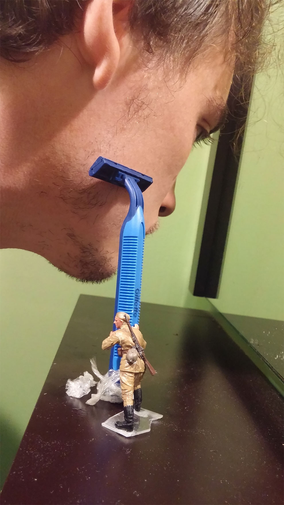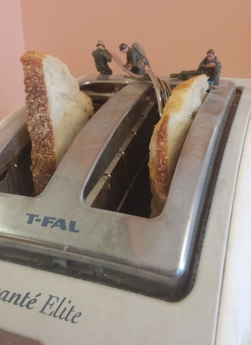 在大家的認知裡,士兵打仗總是為了抵禦其他國家的入侵,甚至是外星人、不明生物的侵犯。不過在模型師Gareth McGorman的照片底下,迷你的士兵模型卻被拿來攻擊超級沒威脅性的事物。