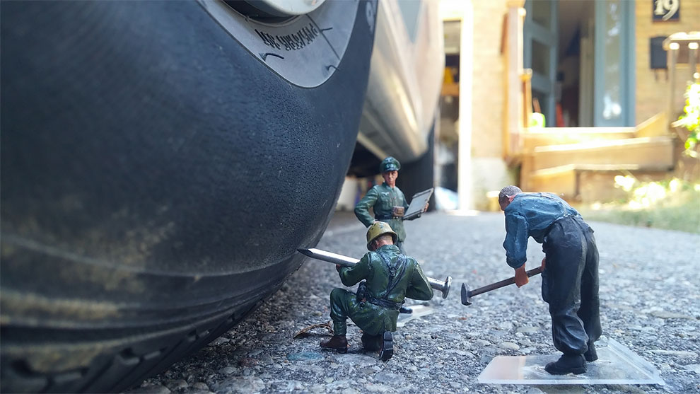 如果Gareth遇到惡鄰居,門口被車子擋住的話,這些模型士兵還要幫忙在輪胎上釘釘子報復。(好小孩不要學喔~這可是犯法的!)