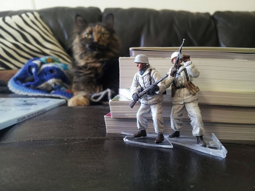 Gareth說:「我12歲的時候就開始製作模型了。會開始這一系列的作品也是因為太無聊,所以就拿士兵假裝偷襲我家的貓,到了後期,我出門也會帶著這些模型,拍攝一些不同的場景。」
