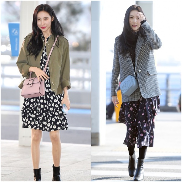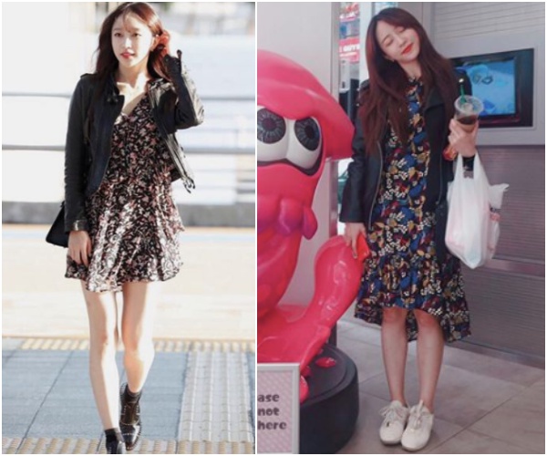 泫雅的私著穿搭其實有時跟舞台形象有些差別,像這兩組碎花的搭配都不是那種小性感的風格,但在顏色跟單品的搭配上都蠻大膽的!像是右邊這一套碎花連身裙內搭粉紫色針織短袖上衣,卻穿上螢光黃長襪搭配老爹白球鞋,雖然顏色的挑選很破格的跳耀,卻穿出一種有點文青的潮流感,一點也跟嬸味沾不上邊!
