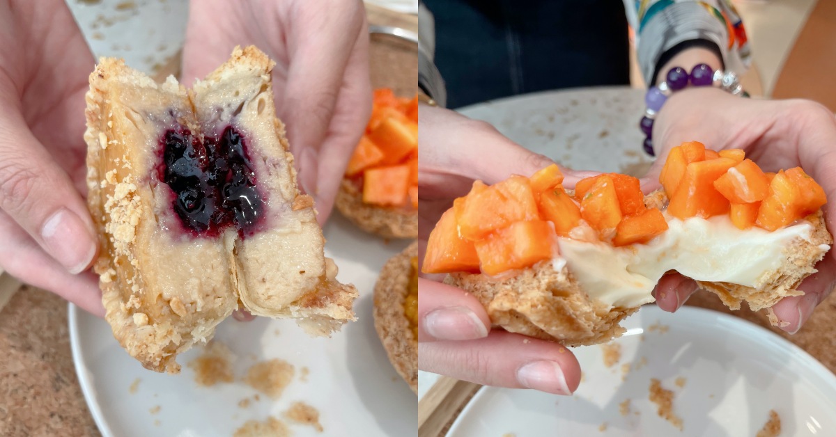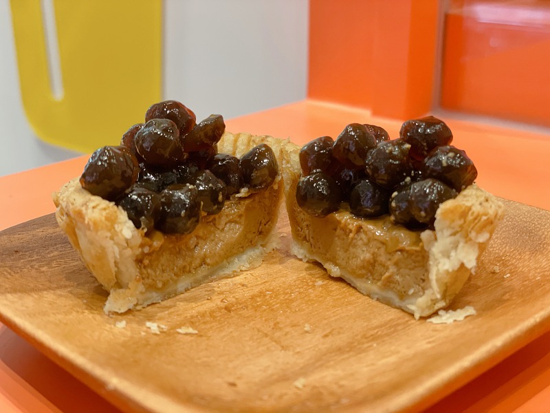 「北海道起司塔」使用清爽又綿密的北海道乳酪與鮮奶,小巧輕盈又不會膩味,是妞編輯個人最喜歡的口味;充滿濃濃南洋風情的「班蘭咖椰塔」,可是相當少見的品項,焦糖醬油加上班蘭葉、椰奶的香氣,入口後嘴裡滿滿的香料味,讓人欲罷不能;「黃金流沙塔」則是使用了鹹蛋黃與奶油乳酪,鹹香不同口感不只不搶味,還非常相稱!