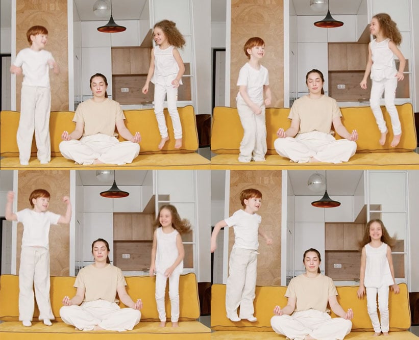 這個遊戲要2個人以上才能玩。數1、2、3,讓孩子們一起同時往上跳,然後拍攝者按連拍功能,看小孩起跳的時機點有沒有一樣,或是有沒有同時落下、踩到地板,直到挑戰成功為止。這遊戲其實還蠻消耗體力的,沒成功就一直跳、跳、跳。妞編輯大力推薦給家裡有多個小孩、每天都被孩子折磨的父母。