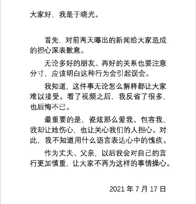 于曉光和韓星秋瓷炫已是夫妻,但近日被拍到讓女生坐在自己大腿上玩遊手機,舉止親密,令網友傻眼,事後夫妻倆也聯合發聲明,于曉光也發聲明向大眾和妻子道歉,表示自己行為不當,未來會更加慎重。