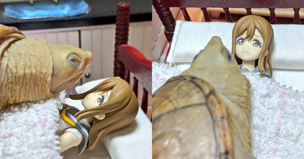 該網友本身很喜歡飼養烏龜等兩棲爬蟲類,他常常在推特上分享自家寵物的生活照,最近也開立一個Instagram帳號分享可愛的龜龜照,裡面有多龜龜跟公仔的合照,每一張都彷彿有旁白,超有意境~