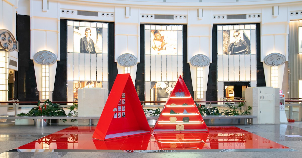 BOTTEGA VENETA農曆新年快閃店,以俐落的三角形造型呈現,如同珠寶盒般率性的設計,盒內各配搭帶有懷舊風格的拍立得形象照,並展示最新一季主打單品。
