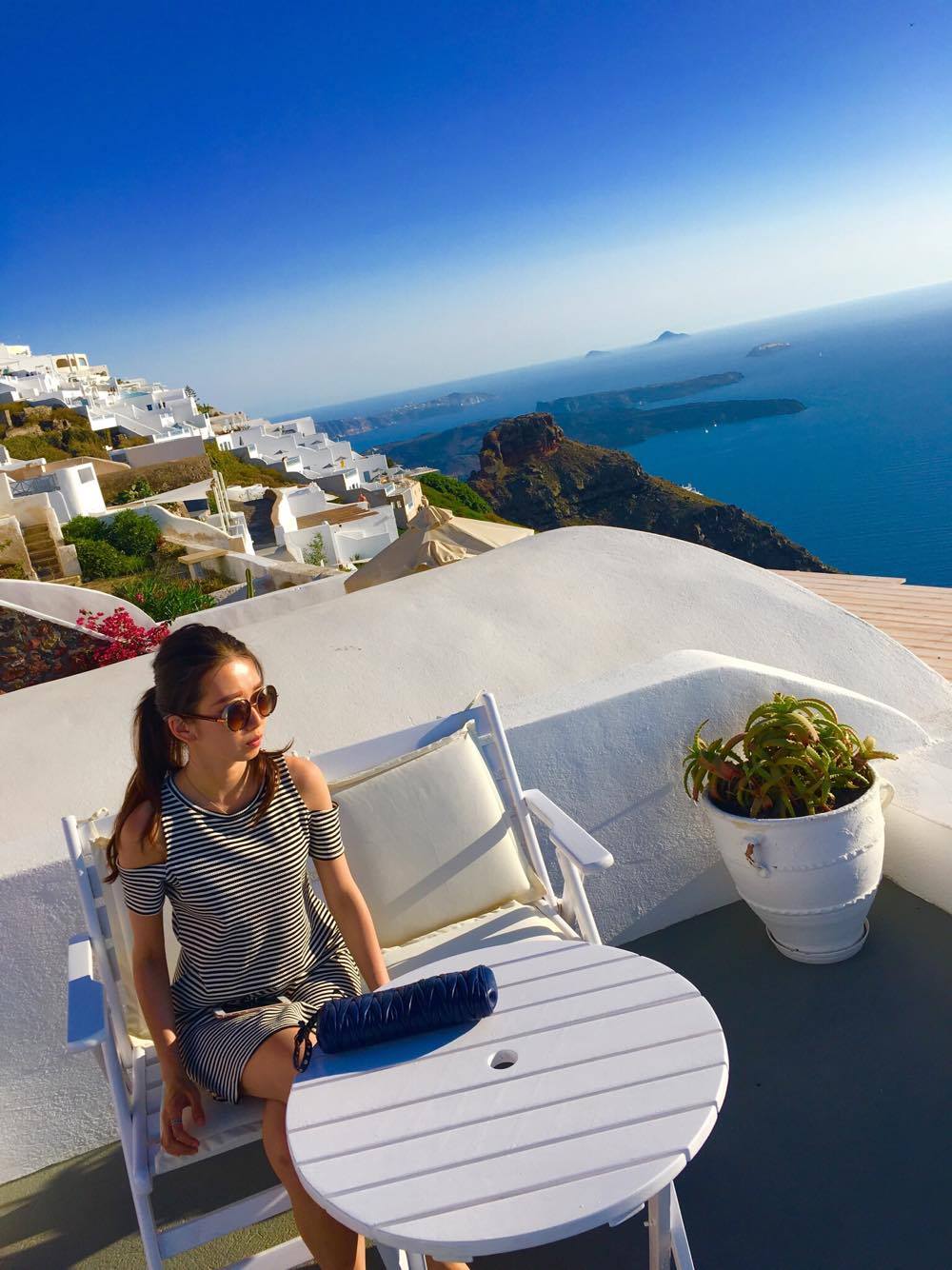 妞妞們有看出來嗎?因為聖托里尼的飯店,是依著山勢層層疊疊的地形建造,比較裡面的房間就稱為「洞穴屋」,而也是由於地勢關係,讓此區飯店幾乎都有露台(大心),可以在飯店獨享夕陽,真的是非常棒的一件事。
