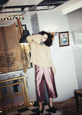 復古的高領衫搭配特殊寬袖針織毛衣的霧面質感來平衡光澤材質寬褲的強烈感覺,最後再投入帶有個性感的競賽底跟鞋就OK!