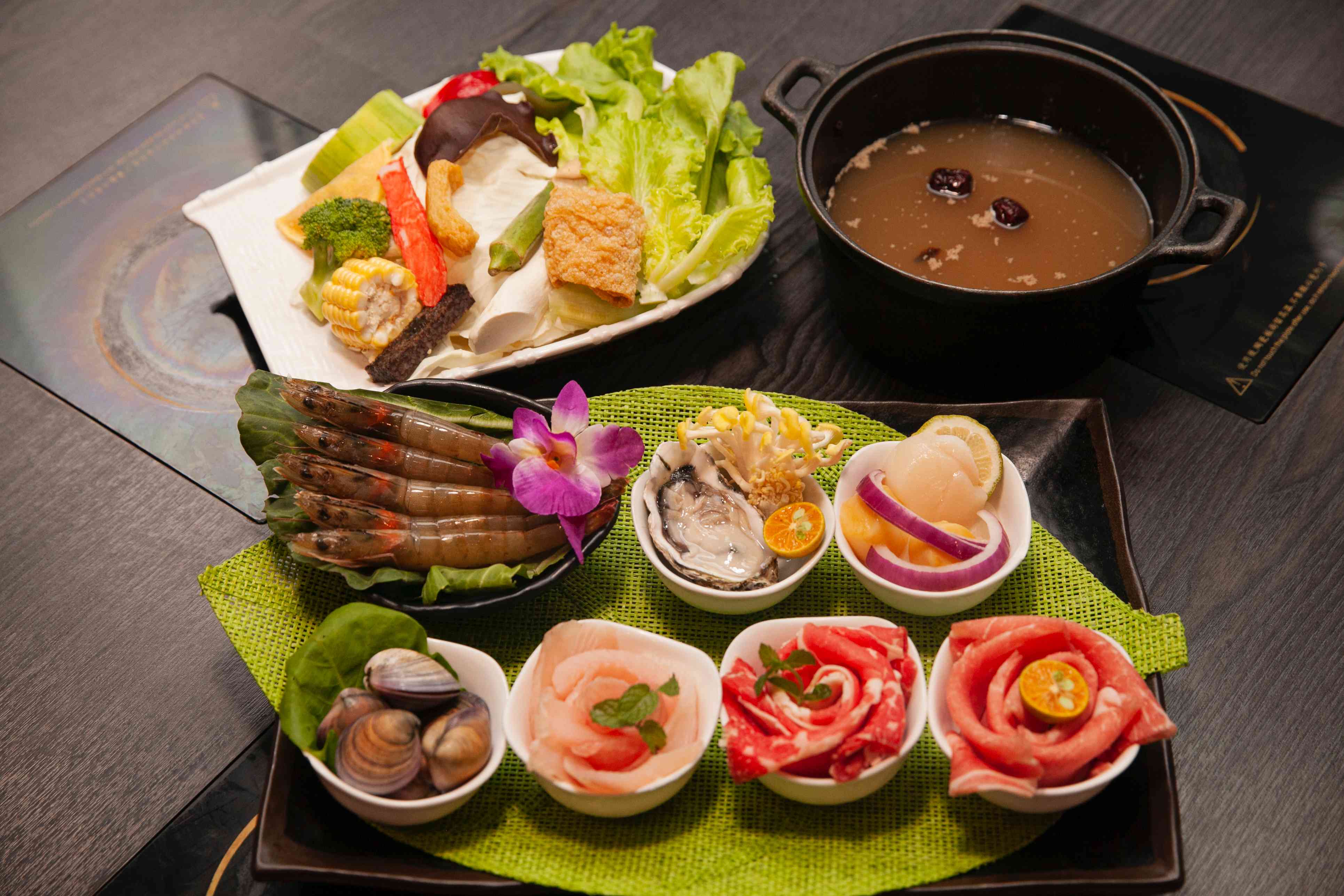 當然,套餐重頭戲還是在這一大盤豪華的「綜合龍蝦海鮮拼盤」,除了有選用天然野放的大成根島生態蝦、白蝦、巨大龍蝦外,裡頭的手臂蝦更是名符其實地跟手臂一樣大!而七品鍋物的雞湯底也是最有人氣的,使用桂丁老母雞細火慢燉,自然的香甜與食材完美融合,彼此相互襯托味道。店長還分享自己初來乍到時,也很訝異店內的湯頭真的僅用日本豚骨與蔬菜熬煮,自然的原料吃完也不會覺得口乾舌燥。(妞妞們是否也有吃完火鍋覺得口渴的經驗呢?這家湯頭清甜入味,不會因爲過於死鹹而吃完感到乾渴哦)