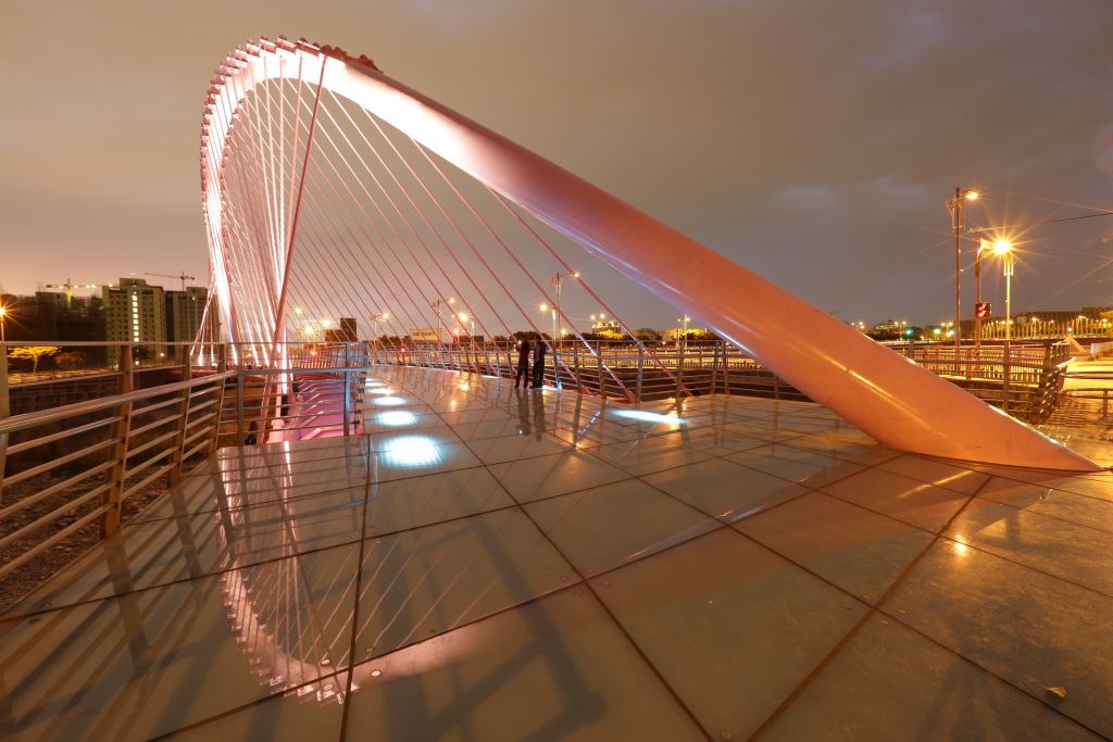 情人橋是由數十條鋼纜拉出的斜張橋,粉紅色的外觀令人感覺到浪漫又溫暖,橋面還是特殊的玻璃材質。