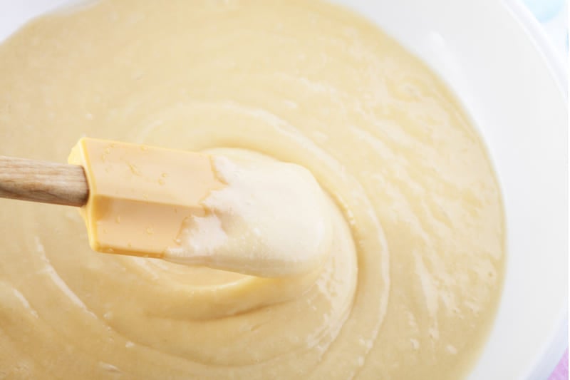 先將糖、麵粉過篩,並將糖、麵粉、蛋黃、萊姆酒以及鹽以攪拌器攪拌,並且緩慢地加入溫熱的牛奶與奶油混合液,持續攪拌約 1 分鐘,或直到完全溶解固體。