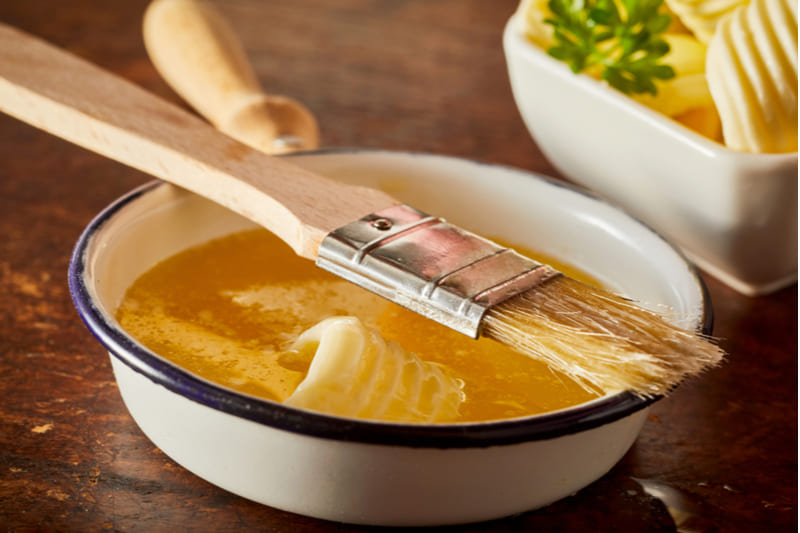 加熱一些備用的奶油,並且使用烘焙刷均勻地塗在模具的內部,盡量多塗一些奶油方便烤製後脫模。(小秘訣:如果提前先將模具冰入冰箱中,會更有助於奶油均勻分布在模具上)