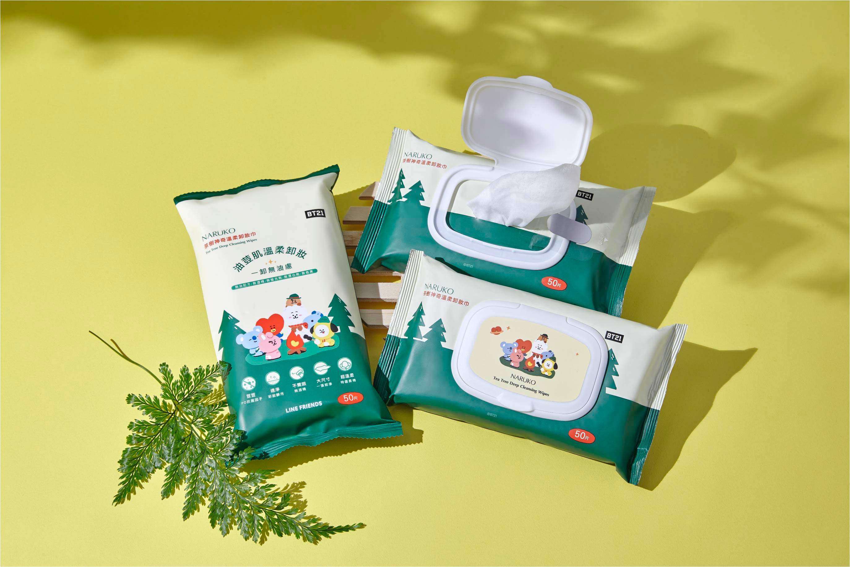 除了原有產品外,NARUKO這回超有誠意推出全新商品「茶樹神奇溫柔卸妝巾-BT21限量版」,標榜無油、無酒精、無色素、無螢光劑、無漂白劑與超高CP值。在官網購入2件還能獲得只送不賣的「吸吸哈哈零油紙」!