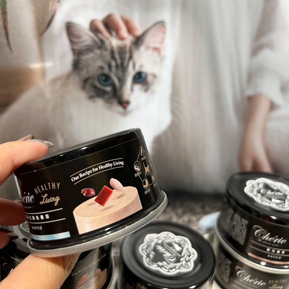 看看這奢華亮眼的包裝,是不是很像法國精緻料理啊!Cherie法麗是很多挑嘴貓可以接受的主食罐,它主打模擬貓咪天然狩獵飲食,裡面沒有穀類過敏原也採低磷低鈉配方,最厲害的是它的絲滑慕絲口感,是全齡貓貓都可以享用的呦~(妞編輯是採半濕食餵法且會搭配乾乾給予~)