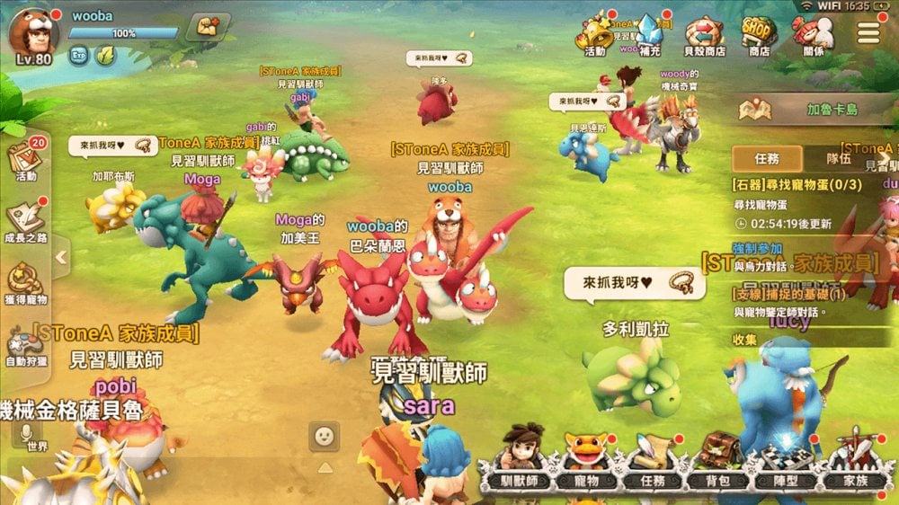 《石器時代:世界》與當年我們玩過的桌機線上遊戲一樣,以「石器時代」為背景,玩家將化身「馴獸師」踏上尼斯大陸,利用石頭與繩索捕捉各種可愛的恐龍寵物。透過點擊即可進行戰鬥,不過妞妞得細心培養寵物、選擇武器、佈置戰鬥陣,創造最強組合,在水田迷宮等地圖組隊對戰。當然,遊戲也加入了社群功能「家族系統」,可以跟朋友來場烤肉派對喔~