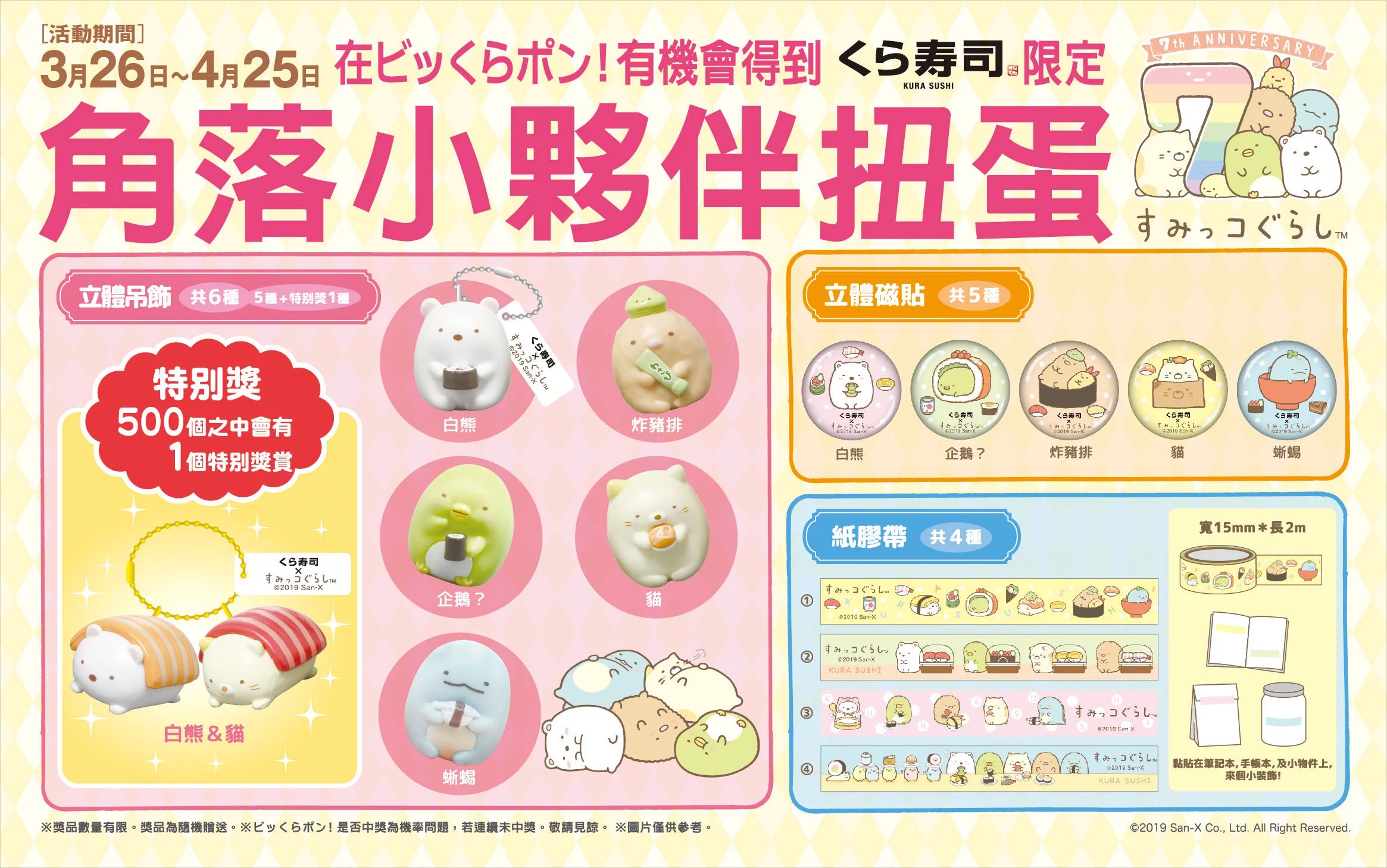 - 店鋪限定活動:即日起至4月25日(四),到藏壽司土城金城路店用餐,有機會獲得日本直送角落小夥伴玩偶(限量20名)。