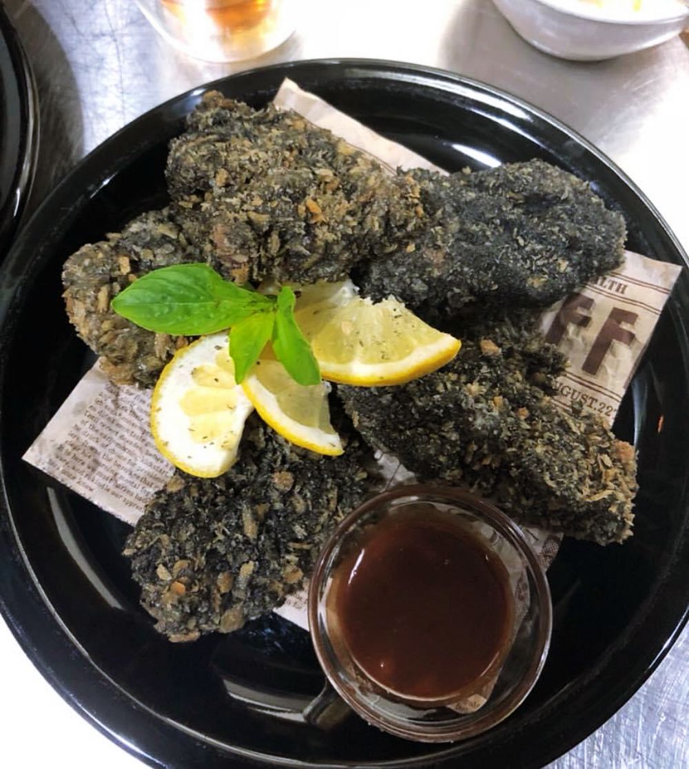鹹食除了有早午餐之外,相當具有黑宅特色的「黑炸雞」也不能錯過,雞肉以迷迭香、薑、檸檬等香料醃製而成,裹上竹炭粉油炸,口感酥脆多汁!