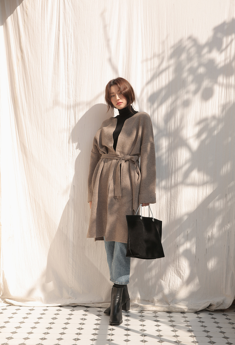 長版針織外套可選擇有腰帶的,直接創造腰身,裡面搭個合身上衣和牛仔緊身褲就很好看!