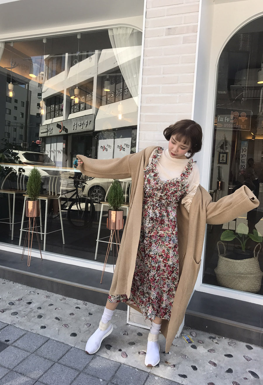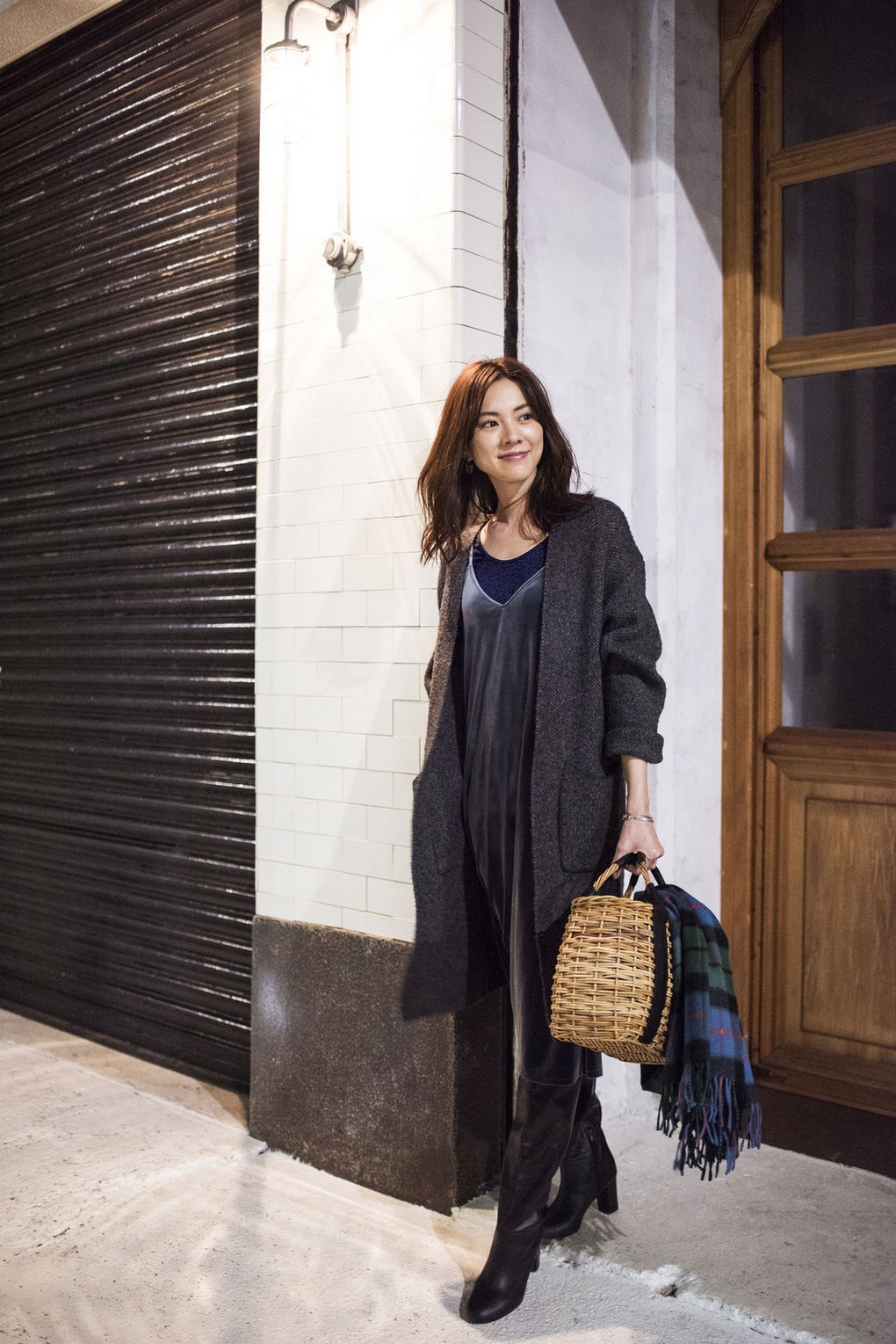 長版針織本身的垂墜度就很夠,所以裡面搭洋裝基本上都不太會出錯,長加長的穿搭技巧如果不是個子太嬌小(可以搭跟鞋增高比例),可以創造出視覺+5公分的效果喔!