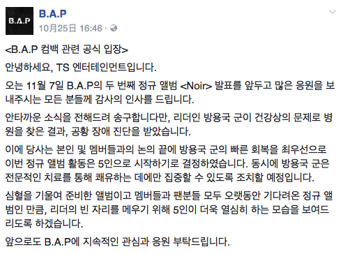 B.A.P所屬經紀公司「TS Entertainment」也在第一時間以4種語言發出官方聲明。