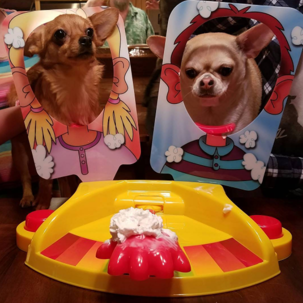 還有兩隻狗狗也來挑戰,望著眼前的奶油派,是想吃呢?還是想說為什麼要這樣對我呢?(也太無辜了吧!)