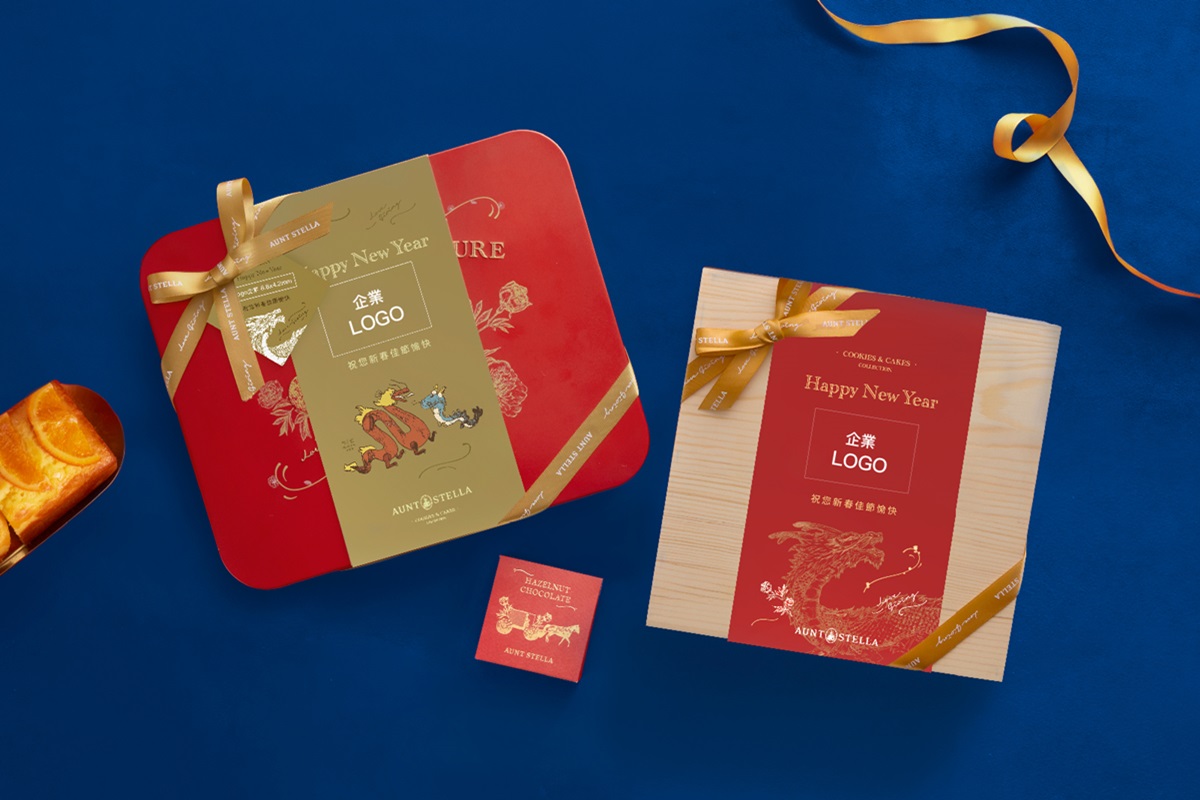 為因應企業客戶訂製專屬新春禮盒的需求,Aunt Stella詩特莉領先業界提供全方位企業客製服務,為您傳遞美好暖心的企業文化,包含吊卡、袖套、木盒、鐵盒,皆可客製印刷設計,輕鬆打造獨一無二的質感禮盒,為收禮者傳遞別具心意的問候喔!