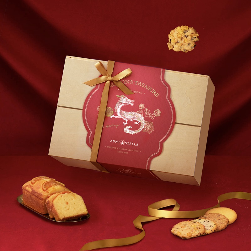 來自東京的手工餅乾名店Aunt Stella詩特莉,使用源自美國的餅乾食譜,歷經東京甜點市場淬煉,成就經典雋永的手工餅乾配方,今年Aunt Stella詩特莉延續備受歡迎的家飾禮盒主題,以「Dragon Treasures 龍的寶藏箱」作為主題,繪製出最尊貴的五爪金龍守護如寶藏般的餅乾,吃到了就能帶來一年滿滿的運氣,無論作為春節贈禮或婚約喜餅都適合,全系列好評如潮已近完售。