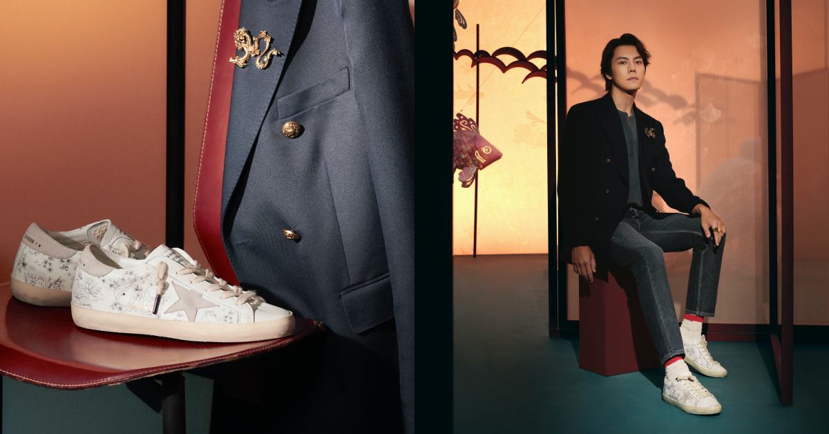 Golden Goose為致敬中國傳統與文化,將現代風格與經典設計交織融匯成全新面貌!由全球品牌代言人陳偉霆演繹這雙「白色限量版Super-Star」休閒鞋以獨特的Golden Goose星星圖案和柔和桃色鞋尾點綴,並融入深植於中國文化中的象徵性圖案元素如中國龍、錦鯉、喜鵲和梅花等,將日常專搭詮釋得精緻又迷人!