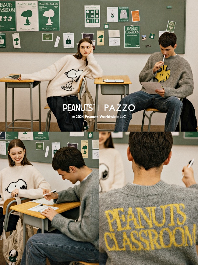史努比這麼可愛,怎麼能不揪團一起穿?以奶油米、霧灰色打造的中性版型針織上衣,分別有小獵犬以及好友「小黃鳥糊塗塌客」整隻出沒,背後還用撞色印著PEANUTS CLASSROOM字樣,跟閨蜜或男友搭配OOTD時髦又有愛,休閒派的CP檔還有聯名抽繩帽TEE可以選擇喔!