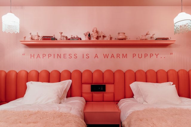 從牆面擺設到毛茸茸被子都是粉色的,還有超巨大的粉色史努比可以抱抱~