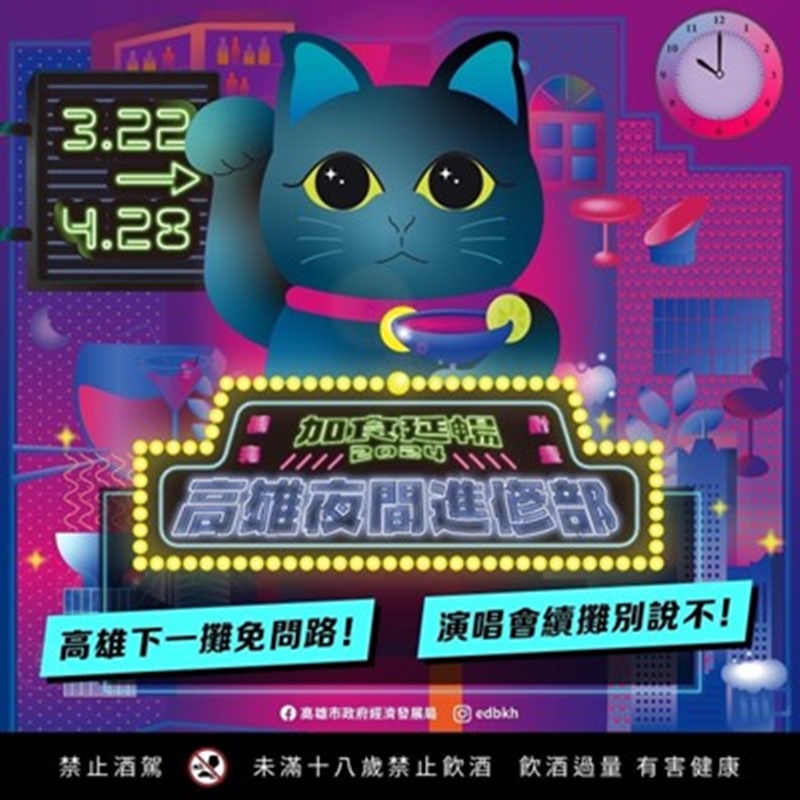 近年高雄儼然躍升全台「演唱會之都」,全球粉絲都能在此一睹國內外巨星風采,如BLACKPINK、COLDPLAY、紅髮艾德等,無一不展現高雄已成功打造「演唱會經濟」的城市特色。今年春季,高雄再度掀起演唱會精彩浪潮,包括7-ELEVEN高雄櫻花季、天團五月天、大港開唱,以及集結多組韓團的拼盤演唱會Golden Wave in Taiwan輪番上陣,預計將吸引逾30萬樂迷到訪港都。高雄市政府經濟發展局也推出「加食延暢」演唱會響應專案,除了延續憑票兌換面額50元的「商圈夜市優惠券」,更加入Bar Hopping「高雄夜間進修部」活動,串聯高雄30多家知名酒吧及餐酒館,還有 26款「港都x音樂」聯名特調飲品,每消費兩家酒吧就能即時線上抽獎,包括萬元住宿券、酒吧宵夜優惠券等千項好禮抽獎機會,邀您開箱高雄夜生活,延續演唱會超High氛圍!