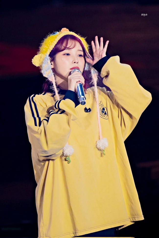演唱會其中一場,穿著黃色大學T的IU,也特別選擇了黃色的「小雞針織毛帽」,帽子上還裝飾大大藍眼睛、睫毛、嘴巴,讓全場粉絲被萌到,大讚女神當天就是「最萌小雞本體」,只不過這款想收同款是不可能的(笑),因為是由粉絲우니親自製作贈送給偶像IU的禮物,沒想到女神真的戴上認證,不愧是最寵粉的粉絲傻瓜。
