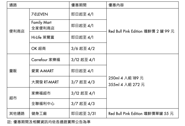 Red Bull同步祭出新品優惠,在四大便利商店、量販通路均享有優惠價,新品上市期間在四大超商均有2件99元的嚐鮮價,更攜手大苑子、台北知名酒吧推出創意調飲,快邀朋友一同感受Red Bull Pink Edition無糖野莓風味的酸甜滋味吧!更多資訊請至:Red Bull。