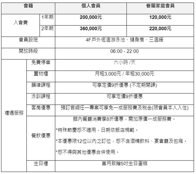 美福活力健身中心除提供完善的軟硬體設施外,並提供多樣專屬禮遇。加入會員後無須另支付月費,若想帶家人一同健身可享6折優惠,並提供六小時免費停車。若運動後想品嘗美食,飯店餐飲消費可享8折優惠,想體驗卓越五星的客房設施,亦提供會員住房專屬優惠,會員生日當月還可享5吋生日蛋糕慶賀,多樣豐富的專屬禮遇,尊榮地開啟健身新生活。