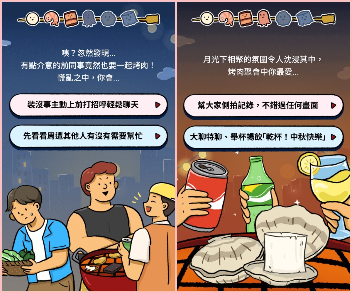第三、第四題則分別詢問著,在大家歡慶中秋烤肉派對時,忽然發現有點介意的前同事竟前來參一腳時會有什麼反應?就在一邊享受月光下的相聚氛圍時,妞妞們通常會身兼「側拍紀錄」的攝影師,亦或是「氣氛祖大師」大聊特聊舉杯暢飲呢?