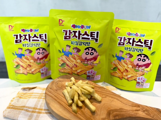 韓國製造的「蠟筆小新羅勒大蒜風味薯條」,以低溫真空油炸馬鈴薯條,口感喀滋喀滋~超酥脆,口味是大眾款「羅勒大蒜義大利麵」,可以在香脆的薯條中感受羅勒大蒜濃郁味道,讓人一根接一根,吃到停不下來啊!