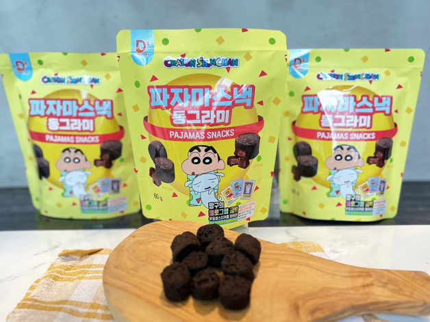 讓小新連做夢都想吃的「蠟筆小新迷你可可風味餅」,包裝上是睡衣造型的蠟筆小新,通過浸潤工法將巧克力滲透到餅乾的每個角落,外層再用可可粉包覆,巧克力和餅乾的mix在一起就像是在享用「布郎尼版」餅乾啊!
