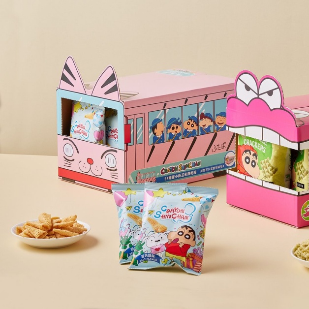 「蠟筆小新派對箱」推出「娃娃車」和「鱷魚山先生」兩款,園長和吉永老師開著娃娃車,春日部小隊全員到齊,娃車內還有滿滿的玉米餅;鱷魚山先生則內有小新包裝蔬菜風味格子餅,不愛吃蔬菜的小朋友也會愛,吃完後還可以當成收納盒!