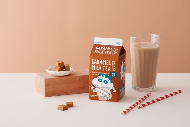 「蠟筆小新焦糖奶茶」採新鮮屋紙盒包裝,用心保留新鮮原味,除了小新之外,還有兩款設計,分別為咖啡色款「妮妮與正在受氣的兔子」和粉紅色款「娜娜子姐姐與害羞小新」!