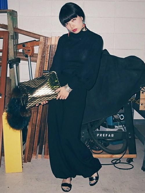 以金色包包為主角級單品穿搭,All Black的搭配更加襯托出個性十足的個人魅力。