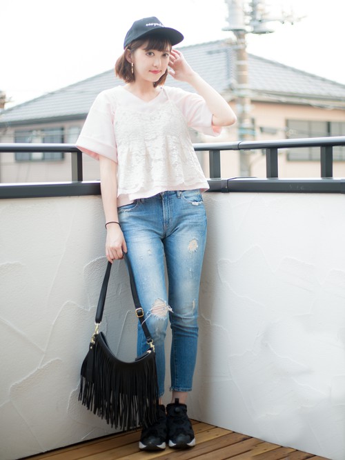 細肩帶穿搭的熱潮依然持續延燒,想把淺色懷舊牛仔褲穿得更加少女,可以參考示範的搭配,選擇粉嫩的淡粉色喔!