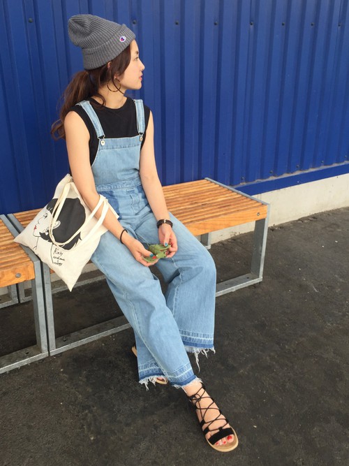 結合吊帶褲以及抽鬚牛仔褲的設計,休閒又可愛!而且搭配今年非常火紅的綁帶涼鞋後,時尚度又更上一層樓了呢!