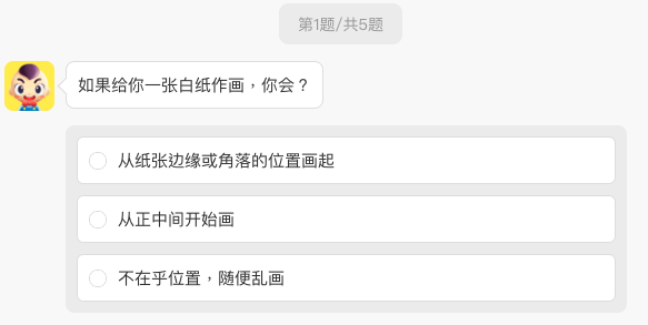 第一題會先詢問如果給你一張白紙作畫,妞妞們會從哪開始著筆呢?選項分別「從紙張邊緣或角落的位置畫起、從正中間開始畫、不在乎位置隨意亂畫」,依照妞編輯沒什麼繪畫天賦的人,毫不猶豫直選了隨意亂畫,想必有在鑽研畫畫的妞妞們,一定會很在意畫畫的位置~
