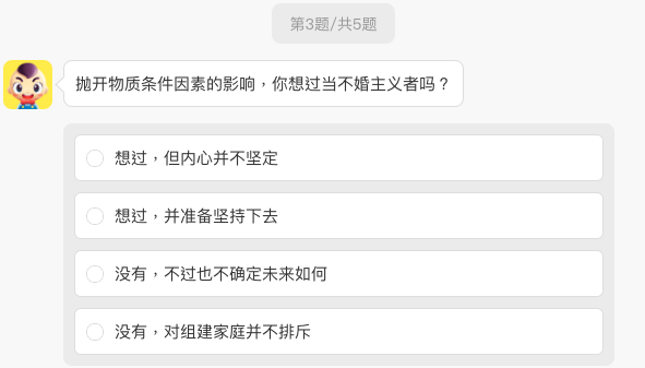 倘若「拋開物質條件因素的影響,妞妞們想過當個不婚主義者」嗎?選項分別有想過/內心不堅定、想過/準備堅持下去,沒想過/不過也不確定未來如何、沒想過/對組家庭並不排斥 共4個選項,妞編輯強烈感受到Z世代的年輕族群越來越朝向不婚主義者邁進呢。(歪樓)