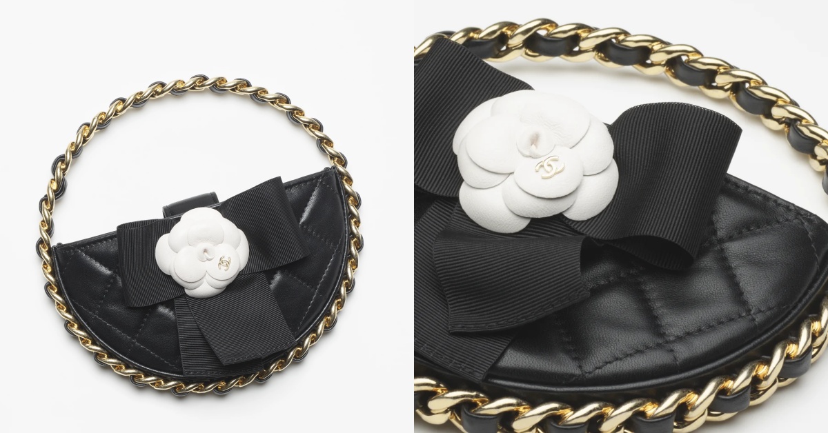 Jennie今年6月出席香奈兒大秀上拿的這款手拿包推薦給進階的派對玩家(笑),結合小羊皮與鑲金的金屬製成,半月形的口袋設計結合香奈兒經典的山茶花以及緞帶蝴蝶結優雅又可愛,圓形的環狀鑲邊設計讓這款包包更像是手鍊,戴上它展現輕鬆的精緻感!