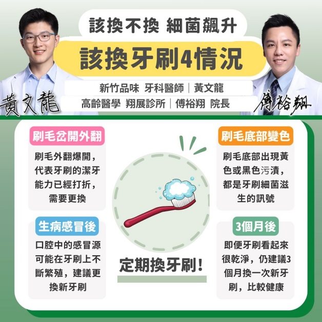 有時候牙刷看似清潔,刷毛仍呈雪白色,但其實刷毛上已佈滿細菌,那麼到底多久更換新牙刷才正確?台灣牙醫黃文龍在Facebook專頁發文表示:「牙刷要每3個月就更換一次,千萬不要為了想省錢而不換牙刷」,因為牙刷放太久可滋生細菌或病毒,放入口內即是把細菌或病毒都吃進肚裡!貼文下更提醒大家見到以下4種情況,便要更換新牙刷,一起來看看是哪種情況。