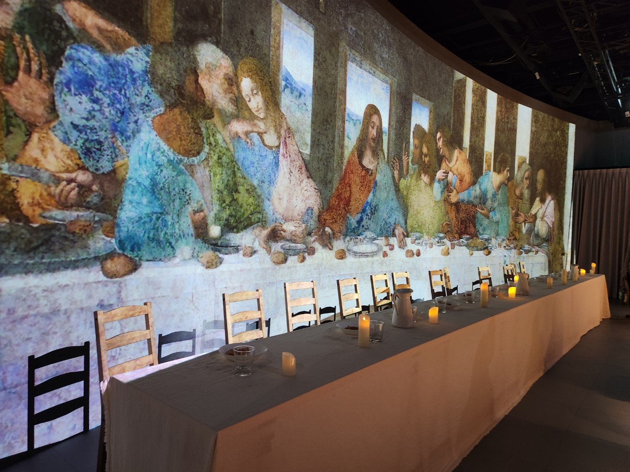 超經典的《最後的晚餐》也在展區中「實體還原」,妞妞們可以坐在長型餐桌上,與耶穌以及12門徒合照,試想這場餐宴背後的哀痛與相互懷疑的氣氛,而大家也能餐桌上看間畫作中唯一的食物「麵包」。