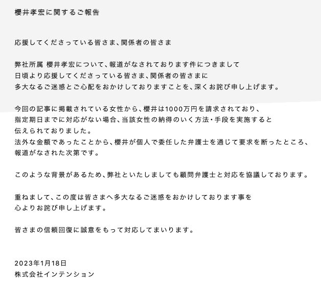 今日(1/18)櫻井孝宏的事務所也發表了道歉聲明,並表示由於對方要求賠償的1000萬日圓金額過高,所以櫻井孝宏的個人律師拒絕了此要求,而導致這次爆料的出現。