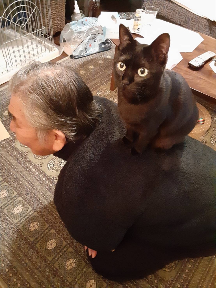 當時那隻瘦弱無助的流浪小黑貓,如今已經長成漂亮的大黑貓,而傲嬌老爸也可以在被露露爬上背時露出寵溺的笑臉了,療癒又可愛的祖孫情治癒了不少貓奴的心,最後推主也分享,其實這些照片都是由媽媽攝影、再經由自己上傳至推特,所以一張張「養貓日常」的背後,乘載了一家人的美好回憶呢!